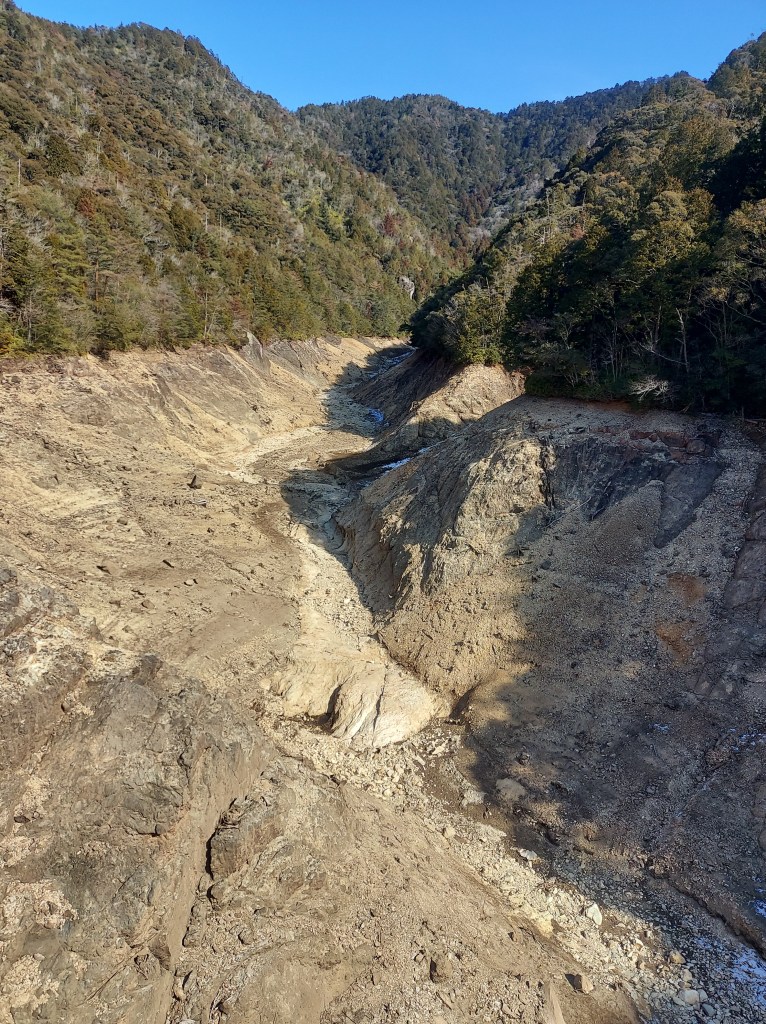 宇連ダムのダム湖である鳳来湖は貯水率が5%となり、湖底がむき出しになっている。